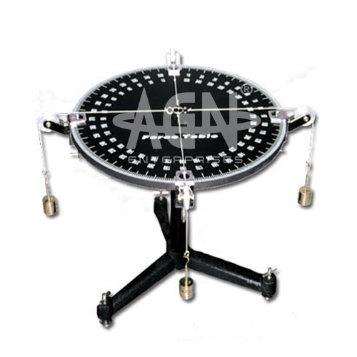 For experimentally verifying the laws of triangle, parallelogram and polygon of forces. Comprising of a circular 40cm diameter aluminium disc, graduated into 360 degrees. Complete with levelling screws, clamping devices to fix the table at any desired angle, five sliding clamp, pulleys, central ring, string and five sets of iron nickelled slotted weights, each set containing nine weights and one hanger of 50gms each.